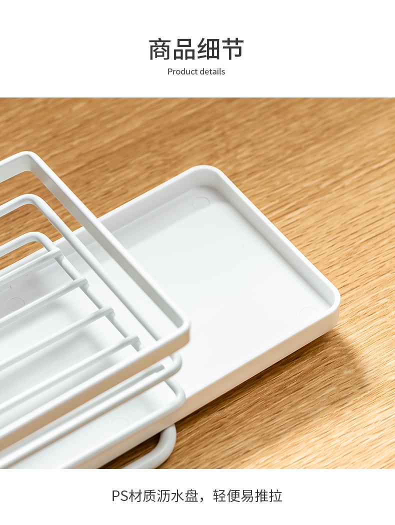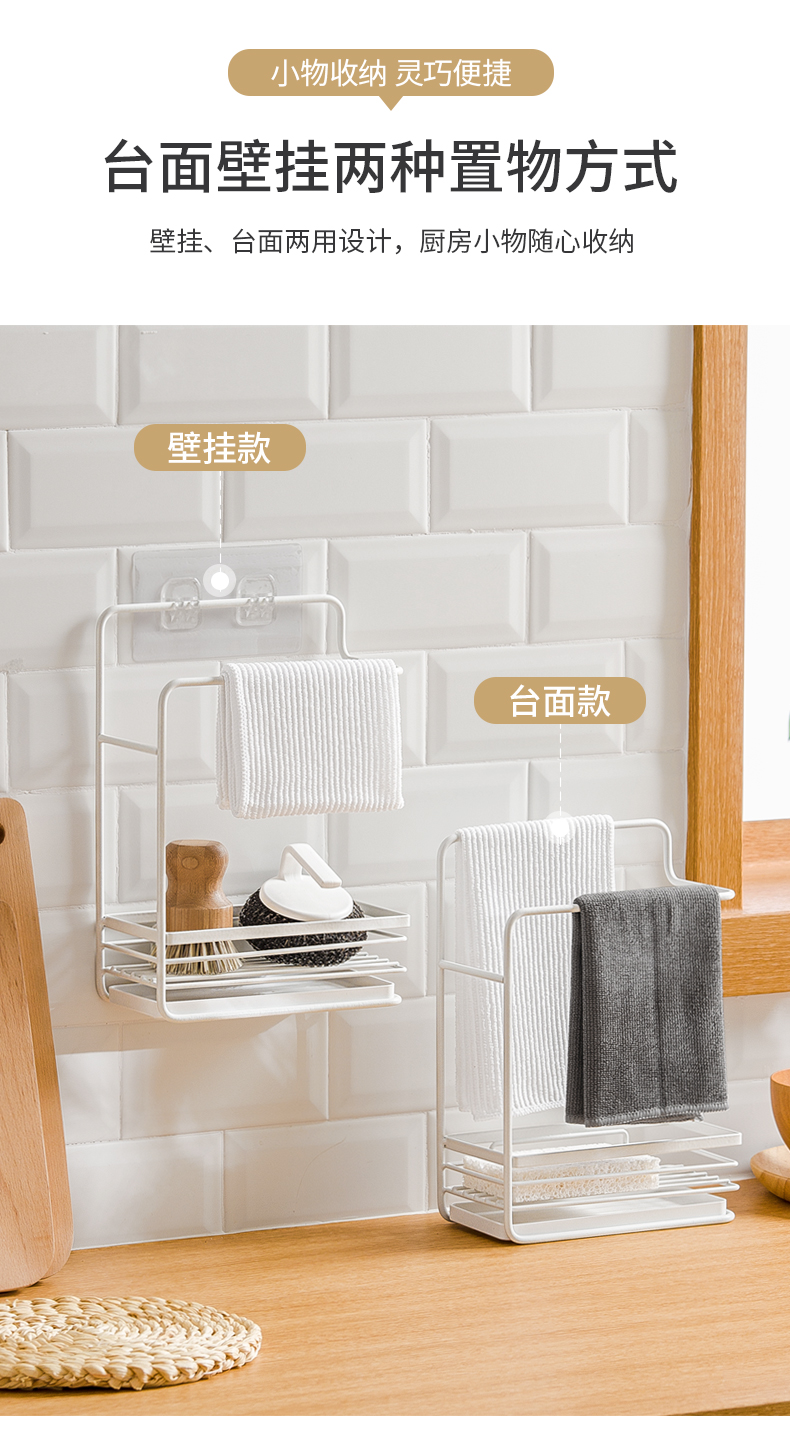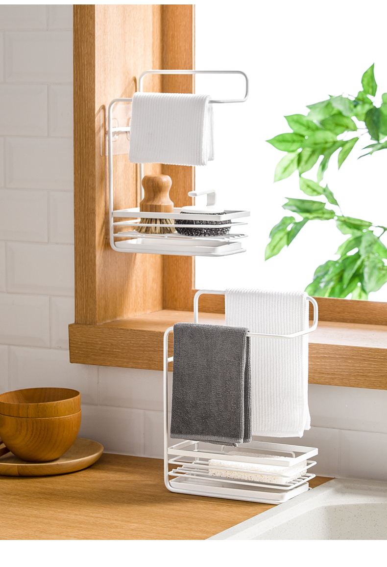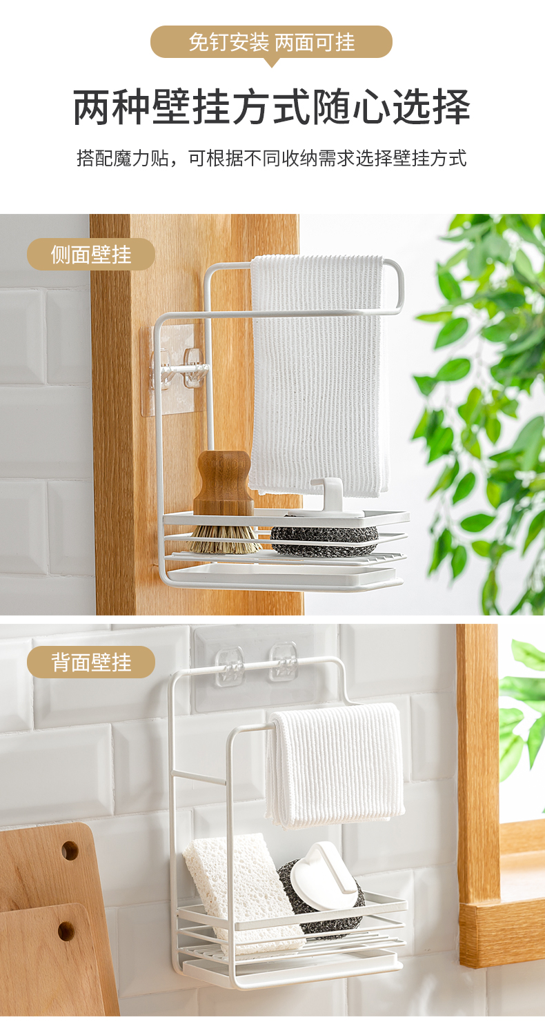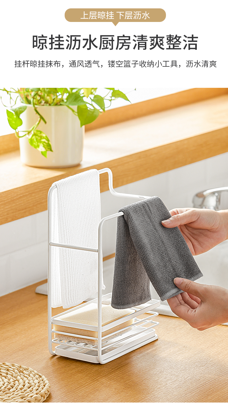 1、雙層收納:上下分區(qū),同時(shí)實(shí)現(xiàn)抹布晾掛與海綿瀝水