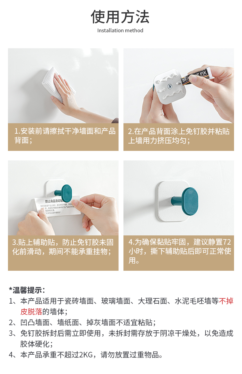 5、免釘安裝:搭配免釘膠,粘合牢固,無需打孔